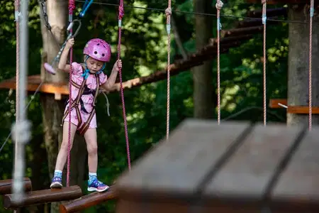 Na výlet plný adrenalinu a zábavy vyrazte s dětmi do Adventure v Deštné. Do dětského lanového parku s trasou nízko nad zemí mohou už děti od 90 cm. Dospělé a děti od 140 cm pak čeká trasa vysoko v korunách stromů.
