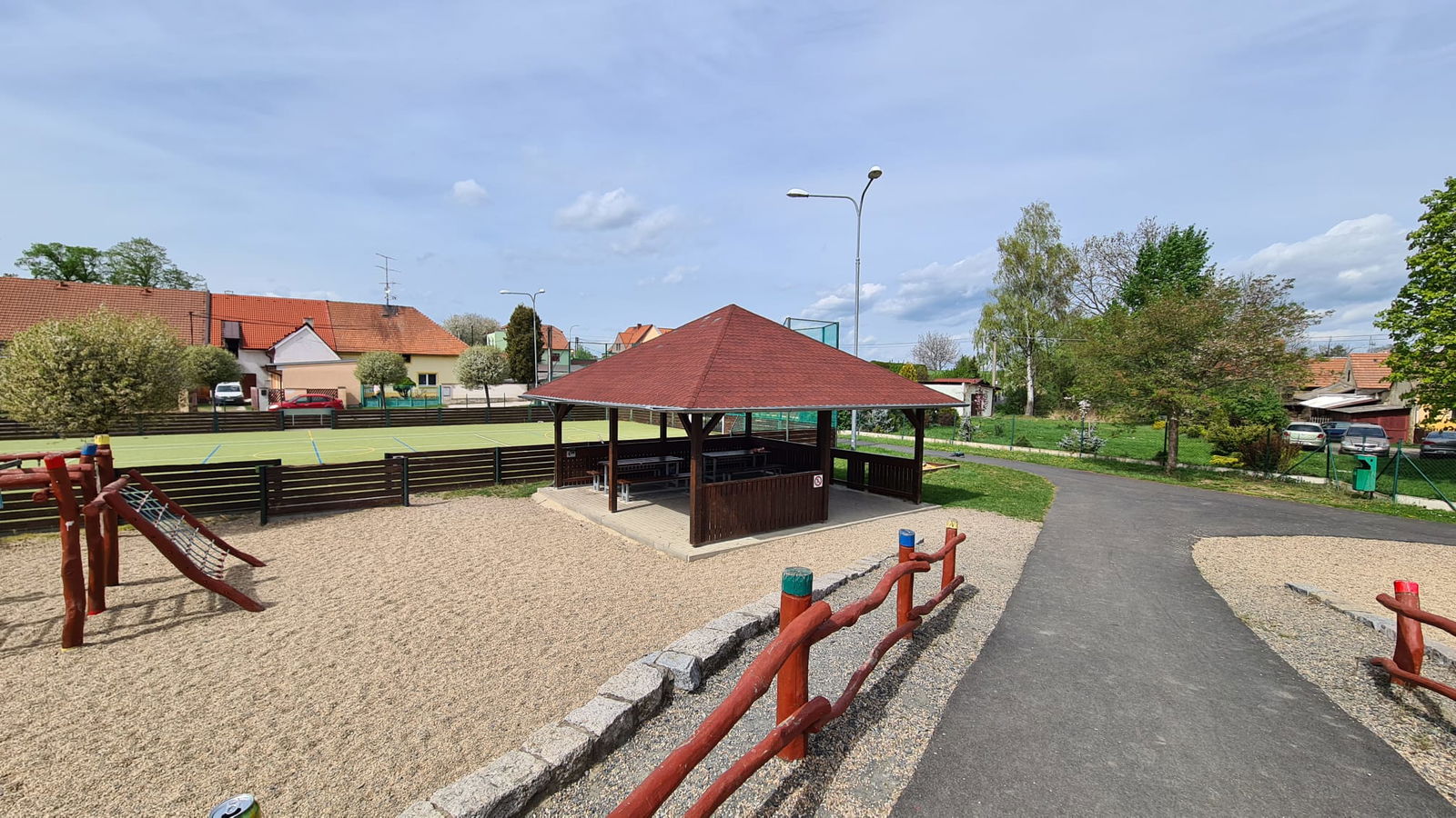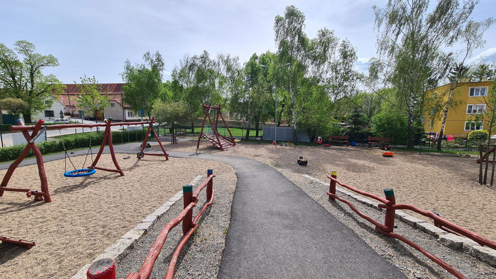 Krásné dětské hřiště v Černuc se spoustou dřevěných herních prvků.