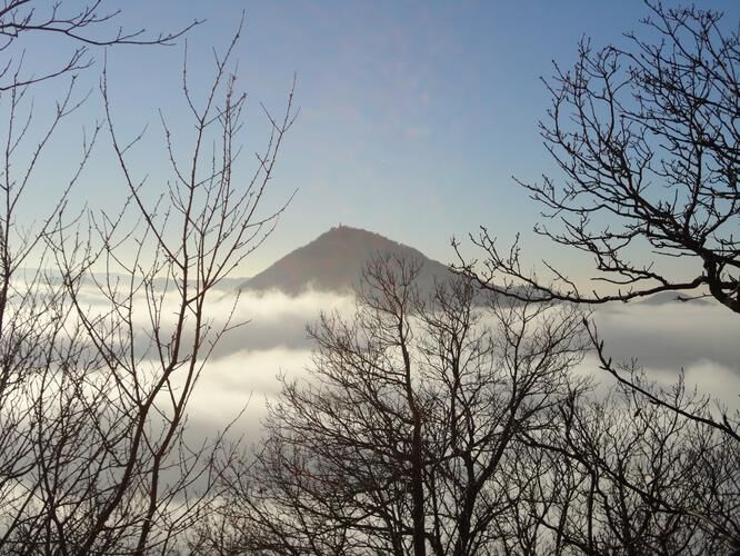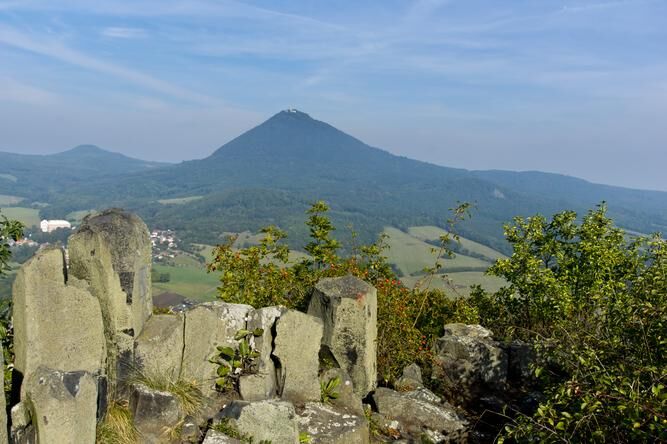 Milešovka, nejvyšší vrchol Českého středohoří (837 m), známá také jako Hromová hora. Meteorologická stanice na jejím vrcholu funguje více než 100 let, rozhledna ještě déle. Tu současnou můžete navštívit celoročně, ale pouze za příznivých klimatických podmínek.
