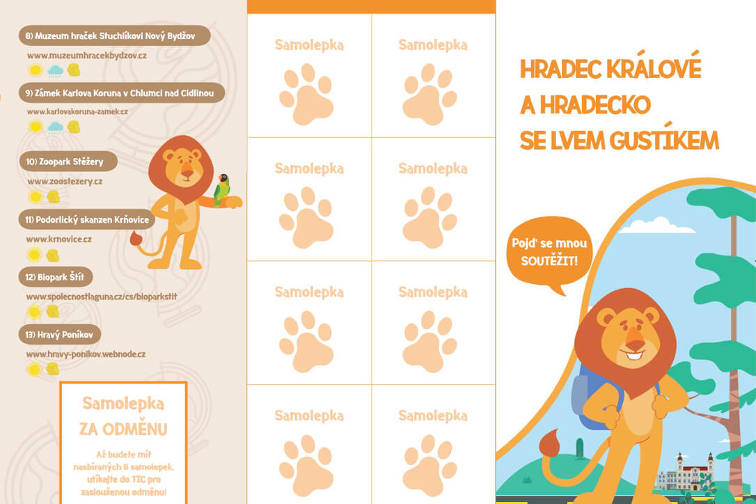 Hradcem Králové vás provede lev Gustík a poradí i výlety do blízkého okolí. Jak na to? V infocentru si vyzvedněte mapu a soutěžní letáček (můžete si je i vytisknout na www.gustik.cz) a dejte se do objevování.