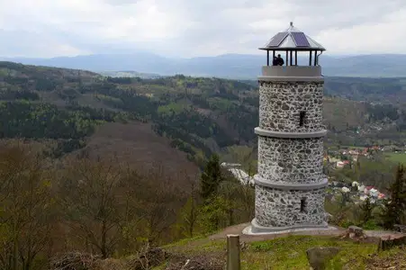 Na rozhlednu vystoupáte z centra obce Kyselka kolem zchátralých...