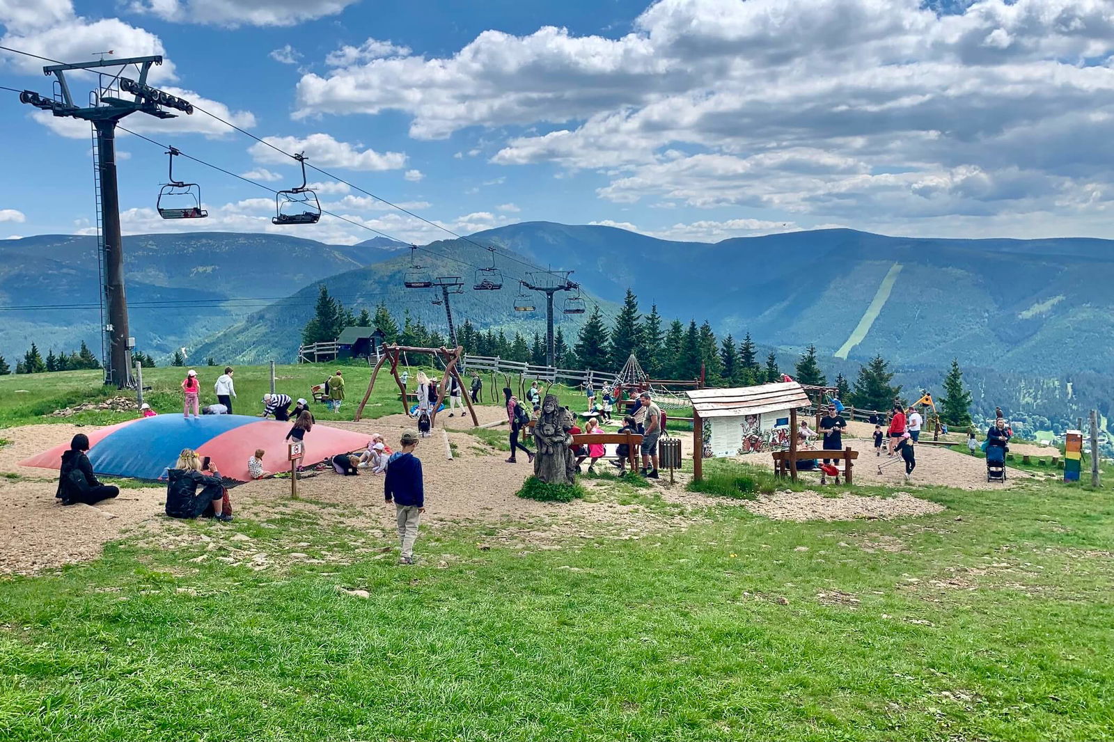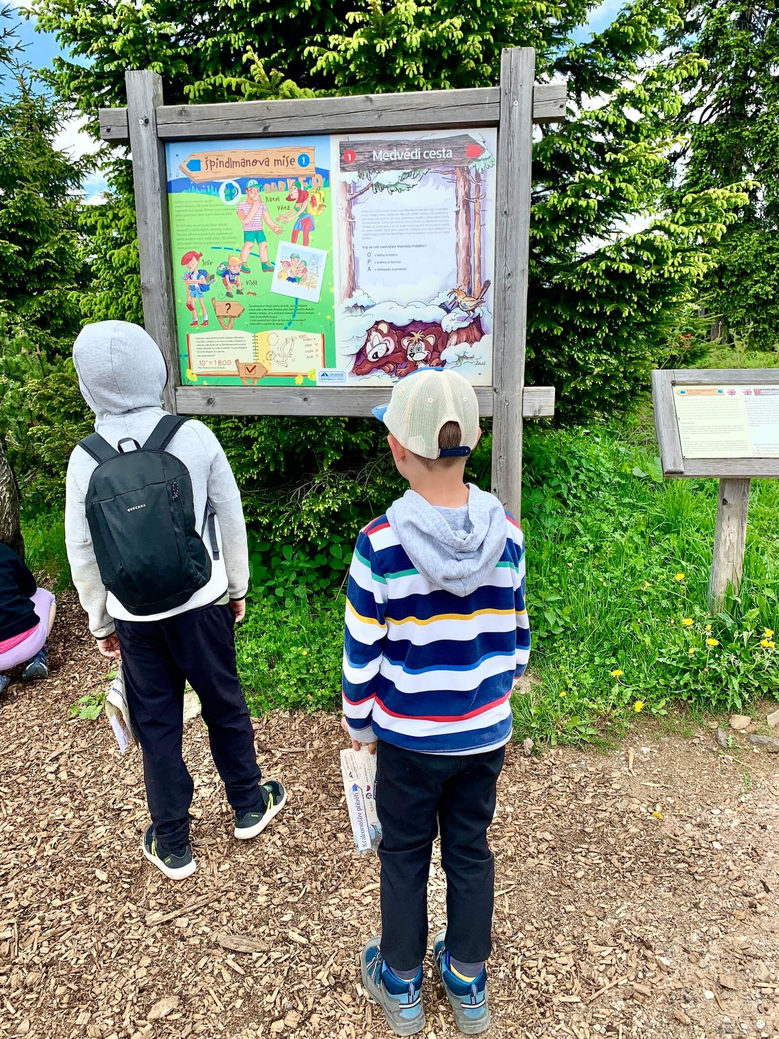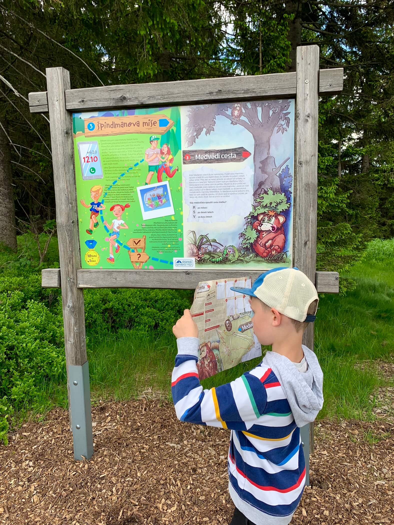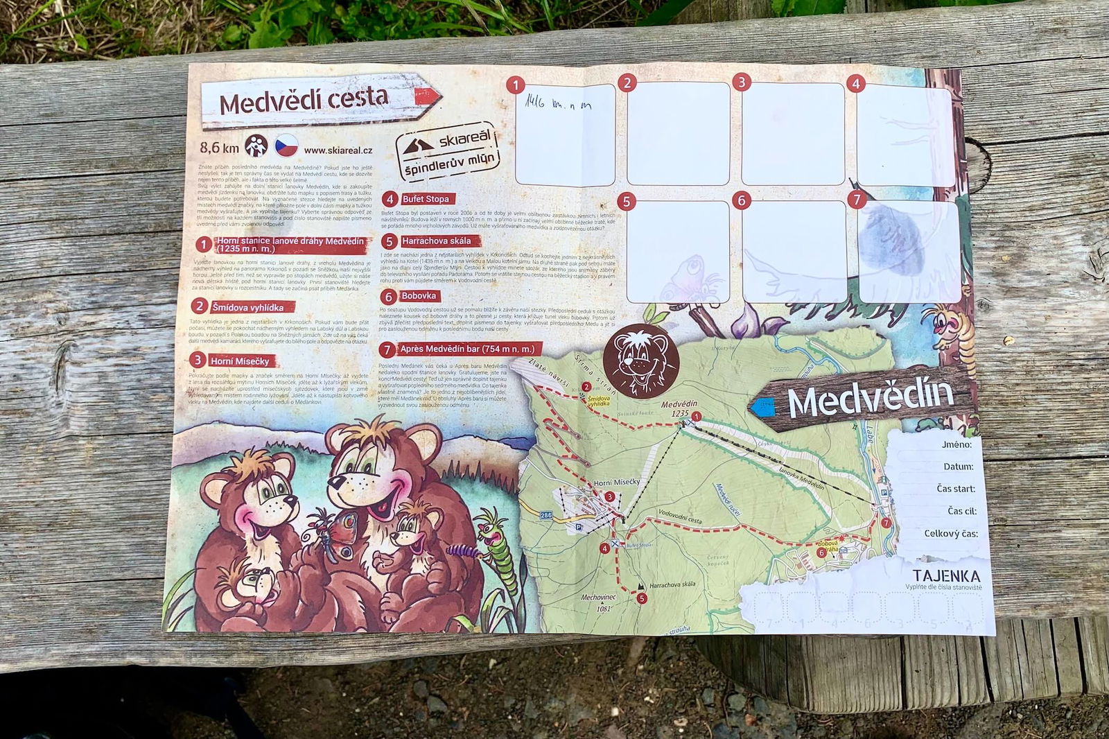 Pohodová stezka pro celou rodinu začíná u horní stanice lanové dráhy Medvědín. Při nákupu jízdenek si v kase vyzvedněte mapku s úkoly a vzhůru za medvědy. Jen pozor, ať se děti nevyčerpají ještě před první tabulí, u horní stanice lanovky je totiž parádní dětské hřiště.