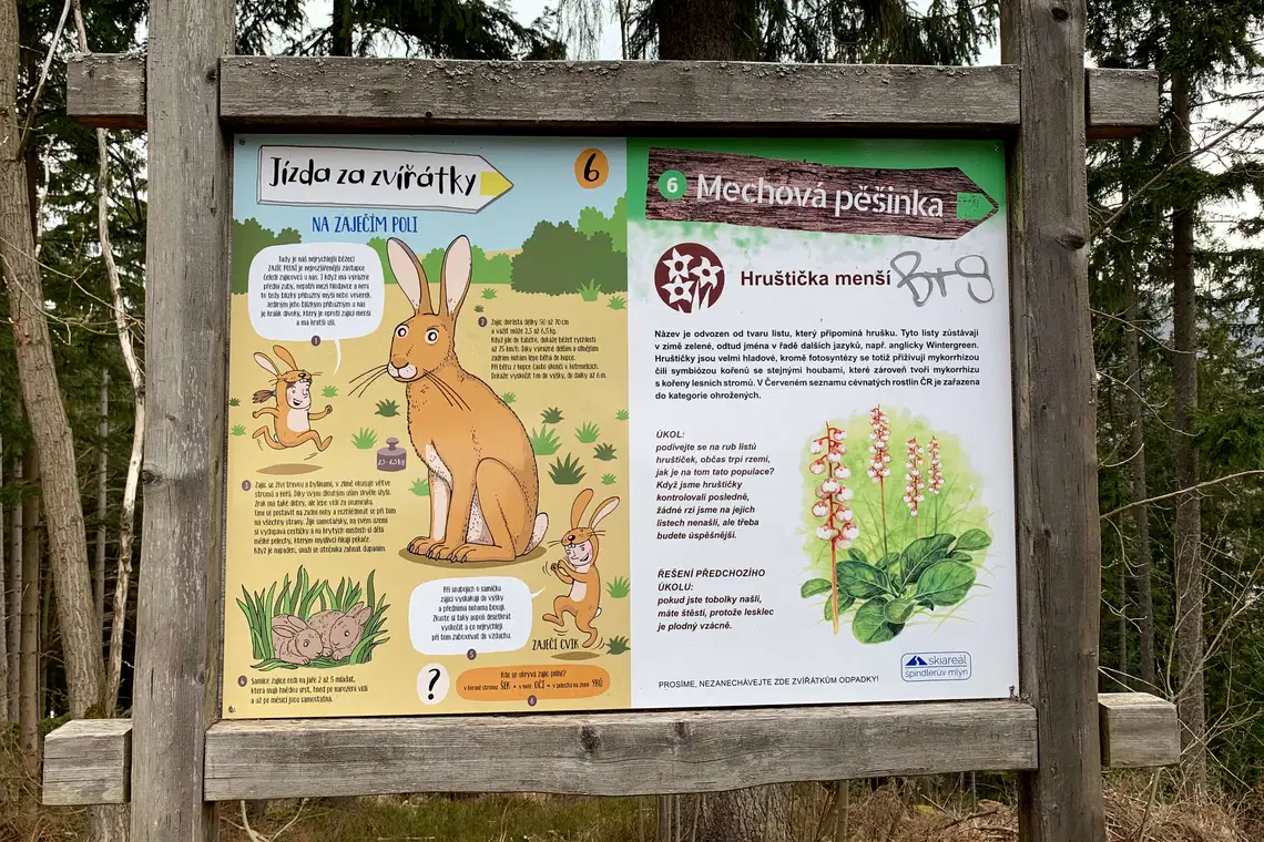 Vydejte se na výlet po stopách zvířátek. Trasa měří necelých 8 kilometrů, ale zvládnou ji i malé děti, celou dobu půjdete z kopce. Cesta je vhodná i pro kočárky, kola a koloběžky, ale záleží samozřejmě na počasí a sněhu.