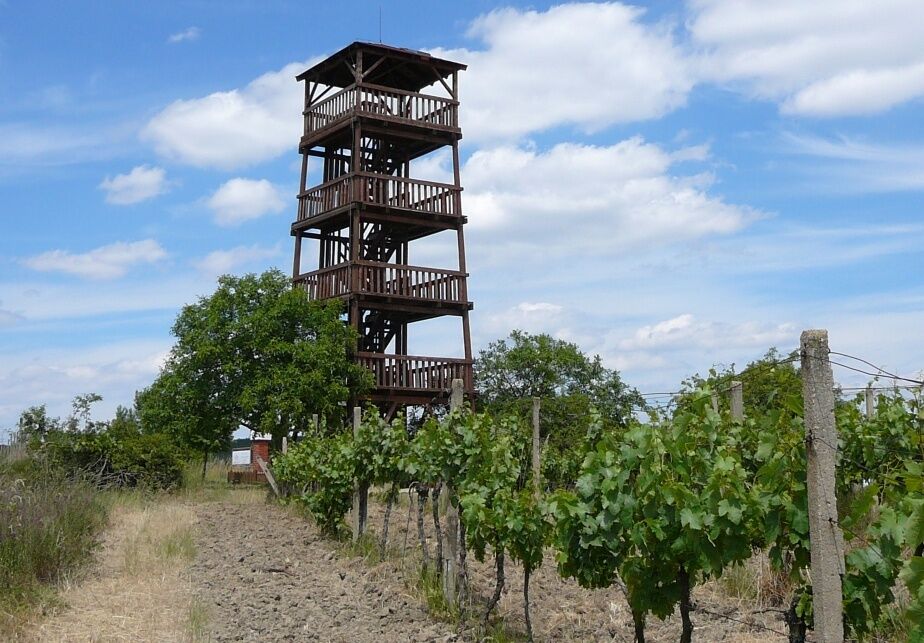 Nádherný je i výhled na okolní vinařské tratě. K rozhledně se dostanete od hotelu Kraví hora...