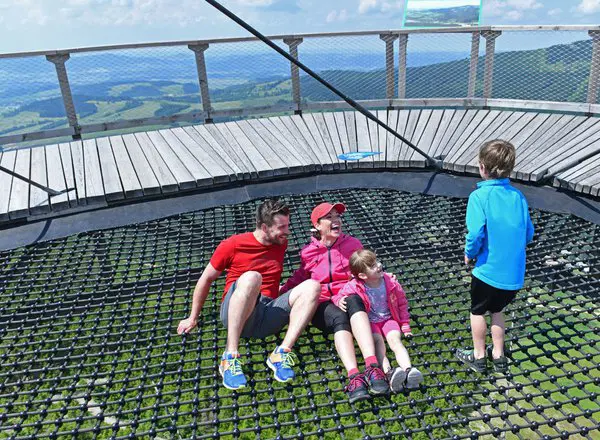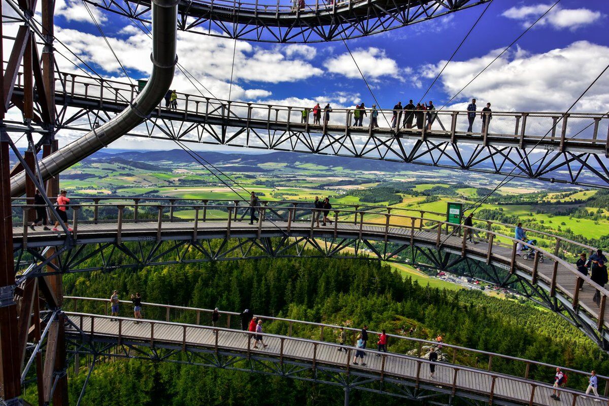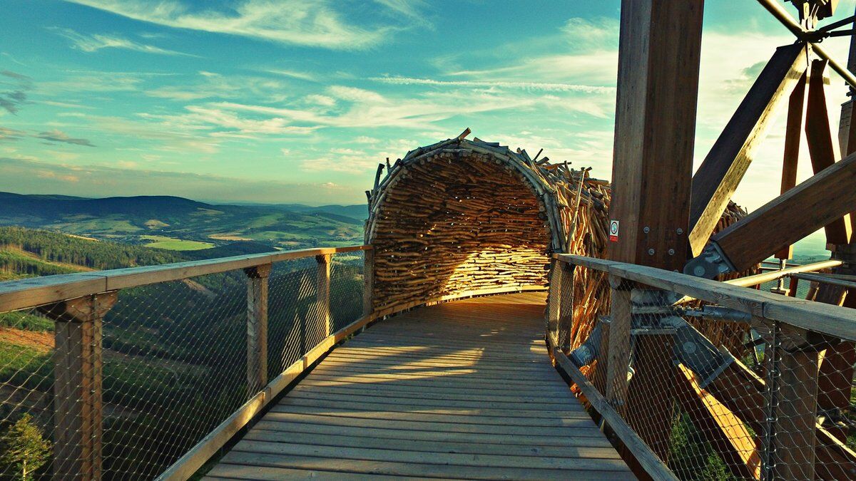 Vezměte děti na Stezku v oblacích v Dolní Moravě. Dřevěná stezka se nachází v nadmořské výšce 1116 m a nabízí nádherný výhled na Jeseníky, Krkonoše a Králický Sněžník. Na trase vás čeká 12 zastavení. Odvážlivci si mohou zkrátit cestu z jednoho patra do druhého síťovaným rukávem. Ve výšce 50 m je relaxační síť, skrz kterou vidíte na zem. Lehnete si? A troufnete si sjet dolů 100 metrovým tobogánem?