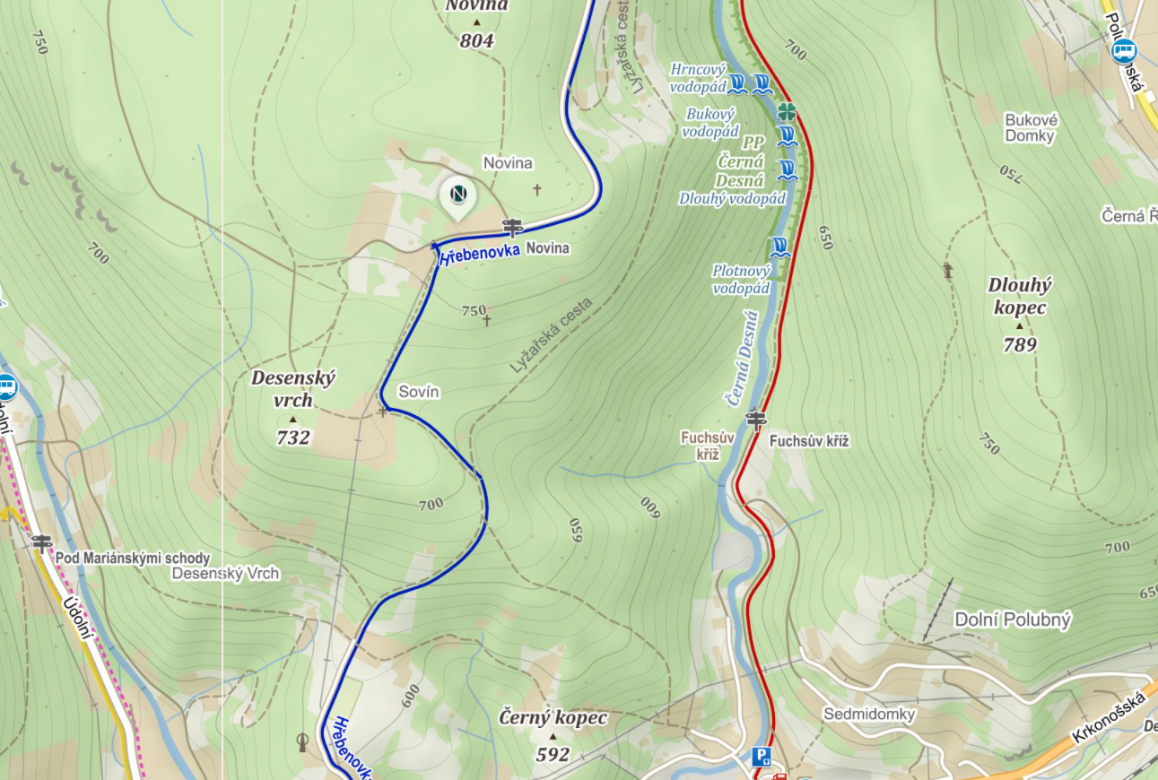 Jedním z nejnavštěvovanějších míst Jizerských hor jsou vodopády Černé Desné. Nachází se na trase Desná - přehrada Souš. Vede k nim tedy červená turistická značka kopírující tok říčky Desná. Vodopády jsou nádherné. Uvidíte vodopád Plotnový, Dlouhý, Bukový (považován za nejkrásnější) a Hrncový. Zpět můžete jít stejnou cestou, nebo po Hřebenovce značenou modře.