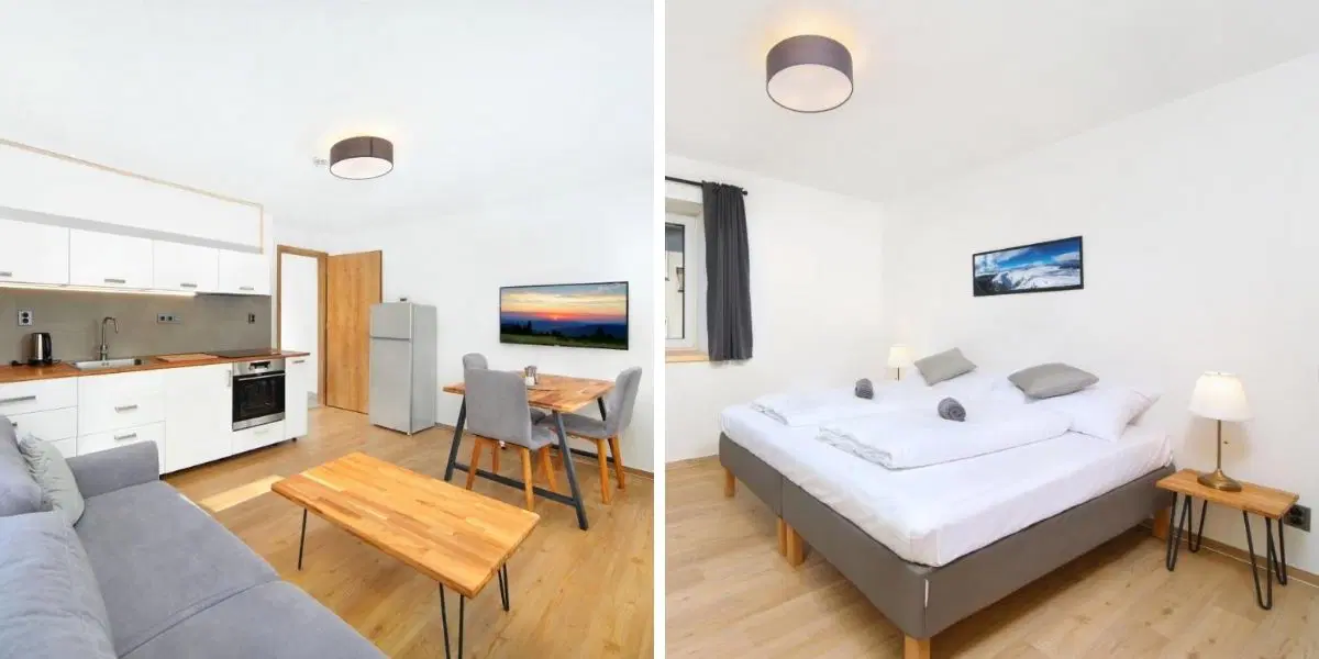 V domě najdete 3 prázdninové apartmány. Dvě plně vybavené garsonky a byt 2+kk, který se stal na 3 dny naším dočasným domovem. Všechny apartmány jsou zcela nově a moderně vybavené. Ocenili jsme bytelný dřevěný jídelní stůl, pohodlné matrace, dostatek úložných prostor i zatemňovací závěsy.