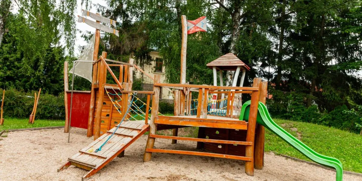 Při procházkách městem jsme objevili dětské hřiště s dřevěnou pirátskou lodi. Najdete ho ve volně přístupné Farní zahradě Českobratrské evangelické církve.