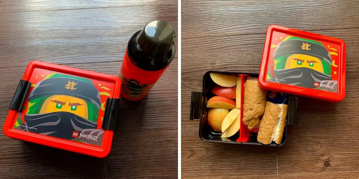 Díky kuchyňce jsme tak naplno využili LEGO láhev a svačinový box s praktickým dělením, které jsme pořídili spolu s kufrem.
