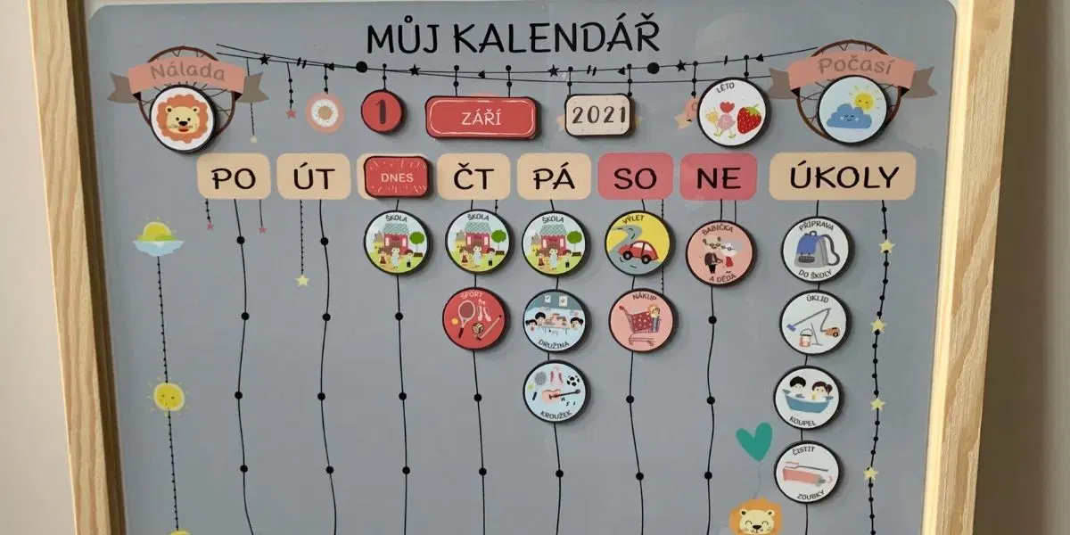 Úplně nahoře si děti nastaví aktuální datum a roční období. Každý den tu mohou zaznamenat, jaké je venku počasí a jakou mají právě náladu. A k jednotlivým dnům už společně s dětmi nastavíte, co je čeká za program a jaké mají úkoly. Splnění úkolů můžete odměnit hvězdičkami. Chybí vám v sadě nějaká aktivita? Dokupovat lze nejrůznější magnetky.