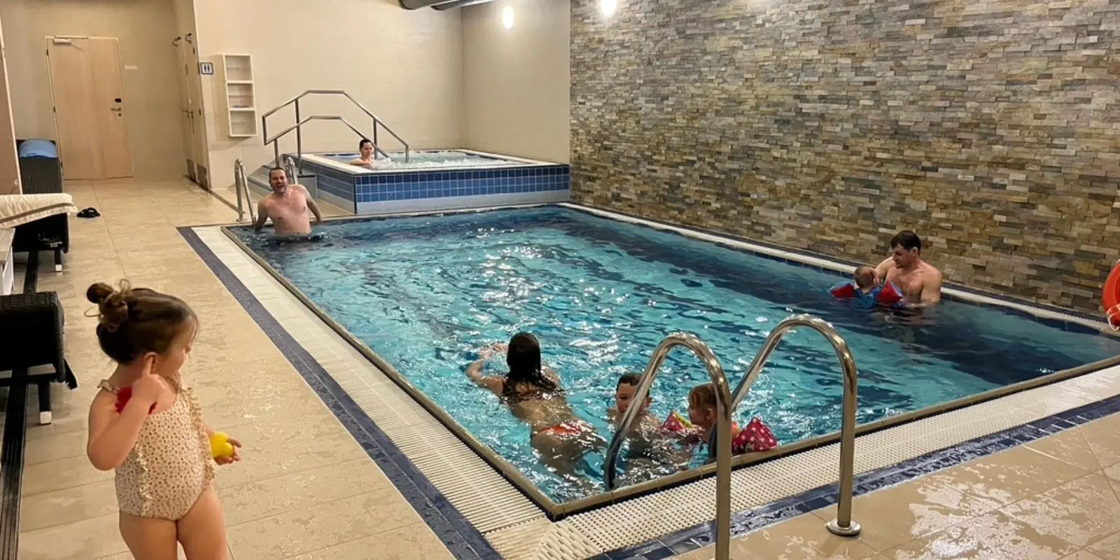 Ještě než malá nastydla, stihli jsme zajít do hotelového bazénu. V době našeho pobytu (03/2022) jsme si museli do bazénu rezervovat termín na recepci, byl zde omezený vstup. Časy byly už dost plné, ale nakonec jsme se vešli. Na druhou stranu bylo v bazénu téměř prázdno a mohli jsme si koupání pořádně užít. Voda byla teploučká jak v bazénu, tak vířivce.