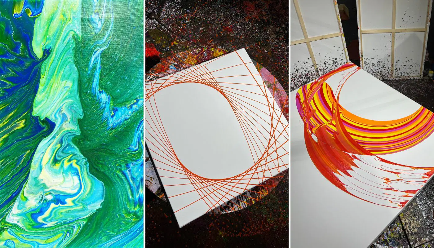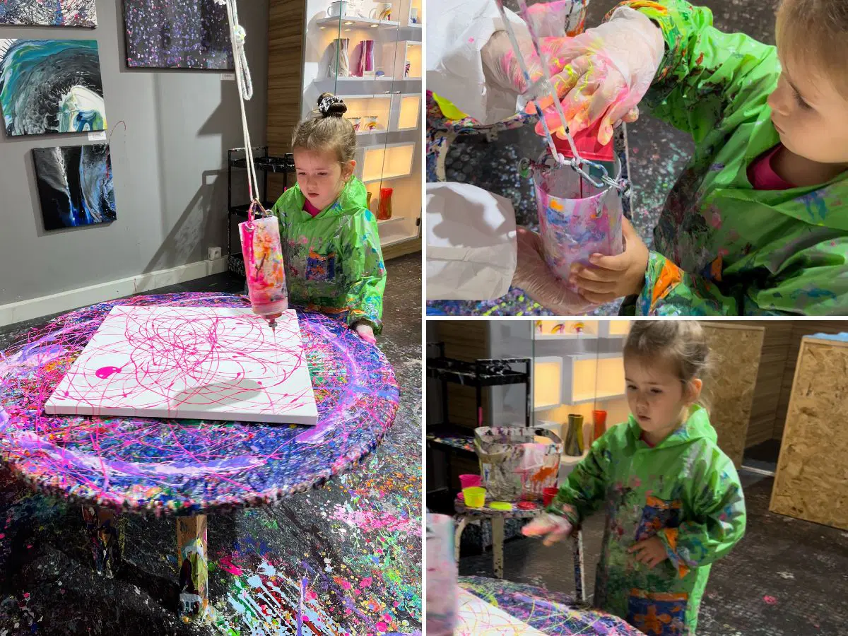 Další fází bylo zvolit si velikost plátna (ze 14 velikostí) a techniku malby. Na výběr máte ze tří druhů: pouring - nalévání barev, pendulum art - tvoření pomocí kyvadla a otáčejícího se stolu, a spin art, které je kombinací rotujícího plátna a zavěšené malířské hrazdy.