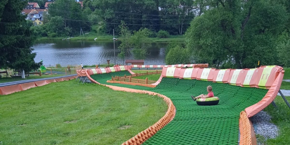 Ve skiareálu Park Frymburk zábava s koncem zimní sezóny nekončí. V létě se mění na zábavní park plný aktivit a úkolů pro rodiny s dětmi . Letos ho pro nás otestovala maminka Jana s rodinou. Podívejte se, co všechno tu na návštěvníky čeká. Hned po příchodu u vstupu se nám věnovala slečna u pokladny, která nám ochotně vysvětlila, co kde máme dělat, kde co hledat a jak vůbec celý park funguje. Dostali jsme Kubíkovu hrací kartičku na stezku, u jednotlivých stanovišť se hledají správné odpovědi. Bohužel jsme neměli úplně nejlepší počasí, tak jsme se museli vyhnout vodním hrátkám, ale pár nadšenců ledové vody jsme u nich stejně viděli. Vzali jsme park útokem a začali jsme pěkně popořadě, nejdřív jsme se zachytali ryby. Potom jsme se dali do střelby na jedovaté houby. Hned za houbami nás vyhlížela děvčata, která se nám věnovala s plnou parádou u sportovních her. Kluci porovnali délku svého skoku do dálky se zvířecími šampióny. Obratnost vyzkoušelo trefování míčem do koše i branky. A za úspěšné zdolání všech úkolů dostali děti bonbon, diplom, deštník s logem médi Kubíka a krabičku na svačinu. Vyzkoušeli jsme originální spojení fotbalu a golfu. Fotbalgolf nadchl staršího syna i taťku. Čerpali jsme vodu ze studny a sledovali cestu vody. Zdolali jsme lanové prolézačky. Navštívili domeček Médi Kubíka i lesní park plný zvířat. Předposlední zastávka byla u živých koz, které je možné hladit a krmit. Vrcholem je tubing, který jsem si neváhala vyzkoušet i já. Když jsme vyšplhali na vrchol, ocenili jsme ranč u Tří Anč, kde jsme doplnili energii. Vše bylo moc dobré. U Tří Anč, také následovala další odměna za vyplnění kartiček. Na každé dítko, které zazpívalo či odrecitovalo básničku, čekal ještě další bonus. Na závěr nás překvapila diskotéka s Méďou Kubíkem, bylo to veselé a originální. Mockrát děkujeme za výhru a možnost si park vyzkoušet na vlastní kůži. Za nás park hodnotíme jako skvělou zábavu pro děti i dospělé, kde opravdu není problém strávit zde celé odpoledne Moc oceňuji ochotný, příjemný a velice profesionální personál. Užijte si léto na Lipně