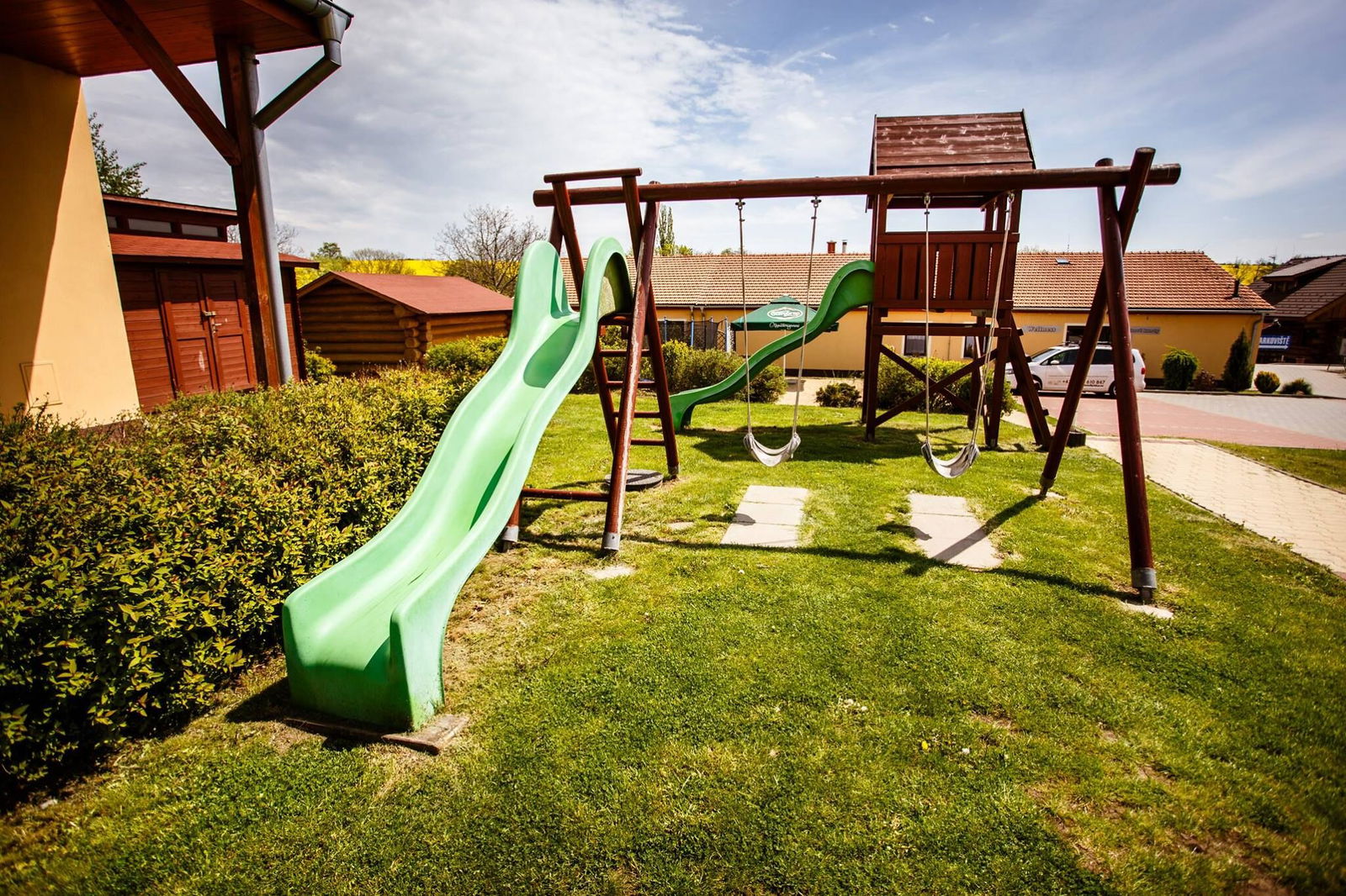 Active wellness hotel U Zlaté Rybky se nachází na jižní Moravě v obci Tupočapy. U hotelu se nachází krásné dětské hřiště, na kterém se děti jistě zabaví. Se staršími dětmi můžete vyrazit na projížďku na čtyřkolkách nebo si zahrát paintball.